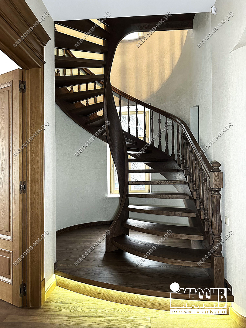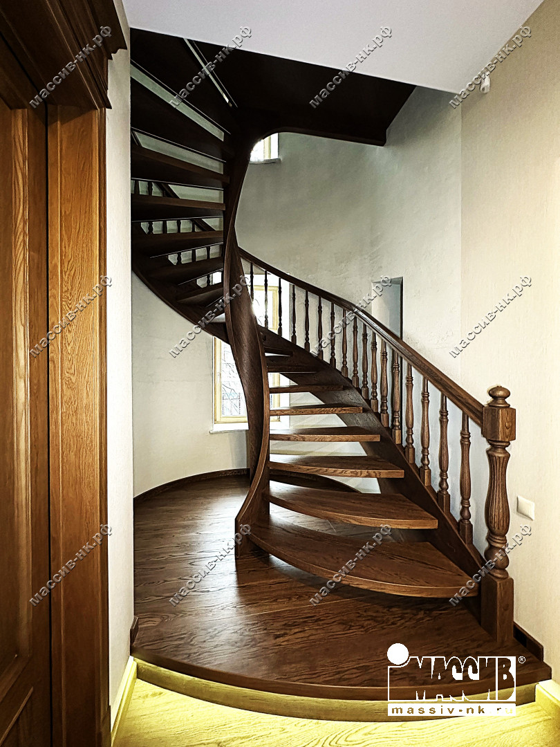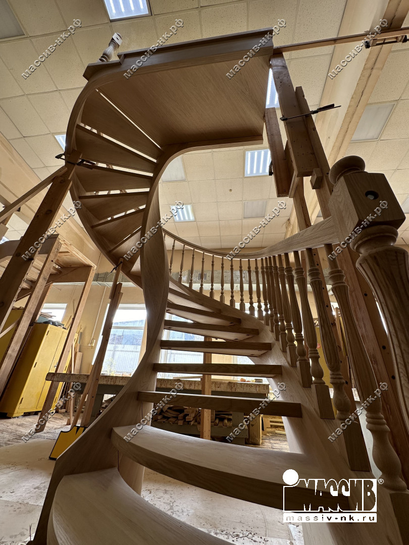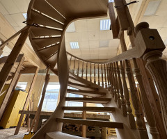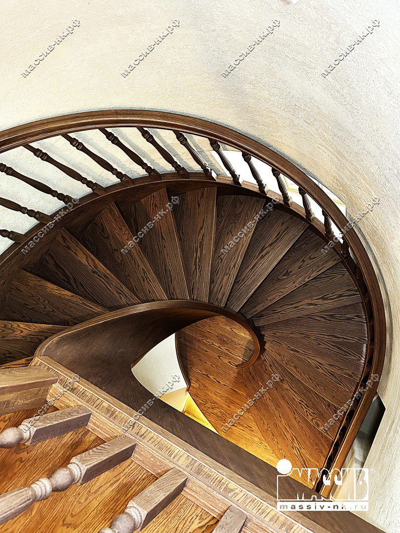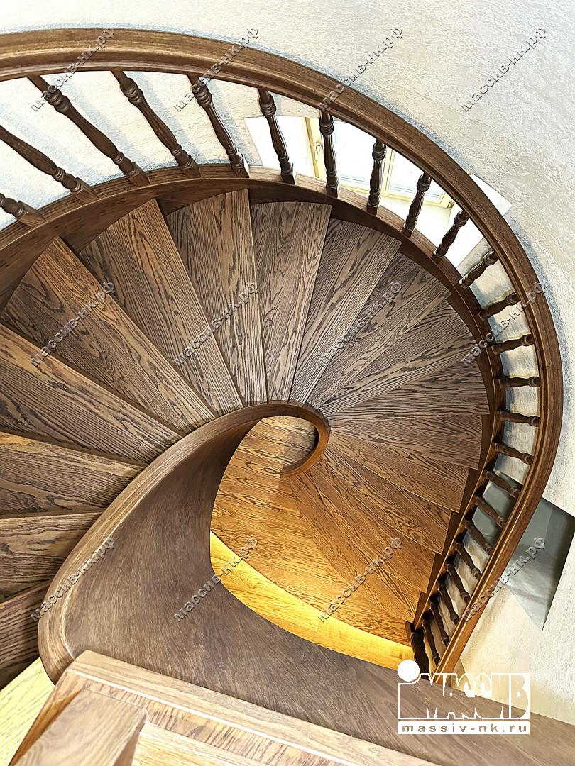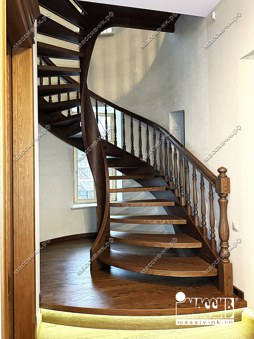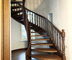 Это открытая самонесущая лестница - с веерными ступенями, поворотная на 270 градусов, на двух несущих изогнутых спиралевидных тетивах. Эта лестница – безопорная, что при её большом радиусе требовало от наших инженеров особо тщательных расчетов лестничного поворота. Она выполнена из благородного дуба комбинированной склейки. Первая ступень лестницы представляет собой радиусный массивный постамент, служащий опорой для лестничной конструкции.