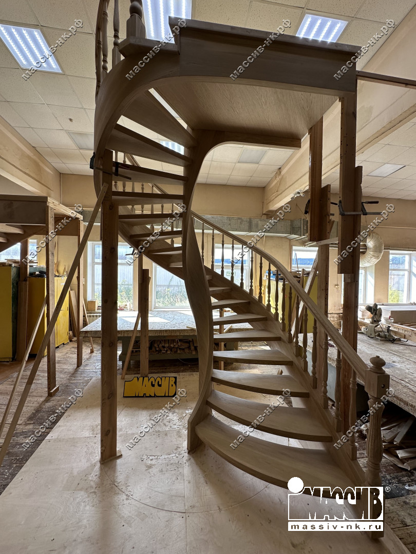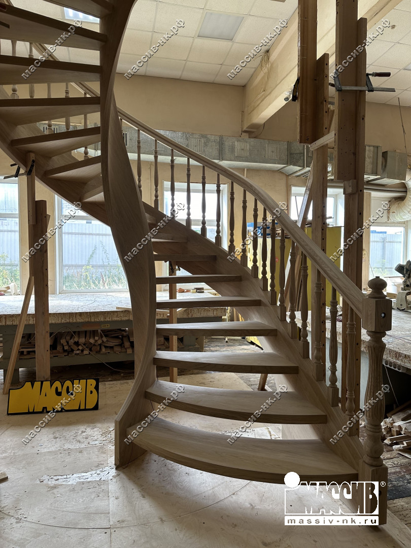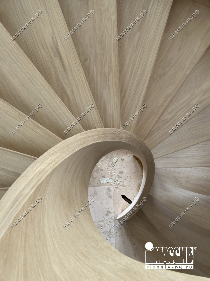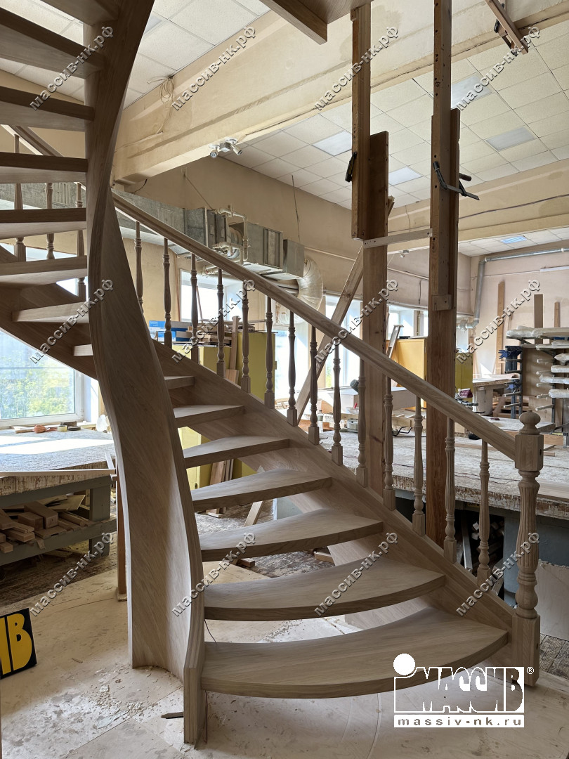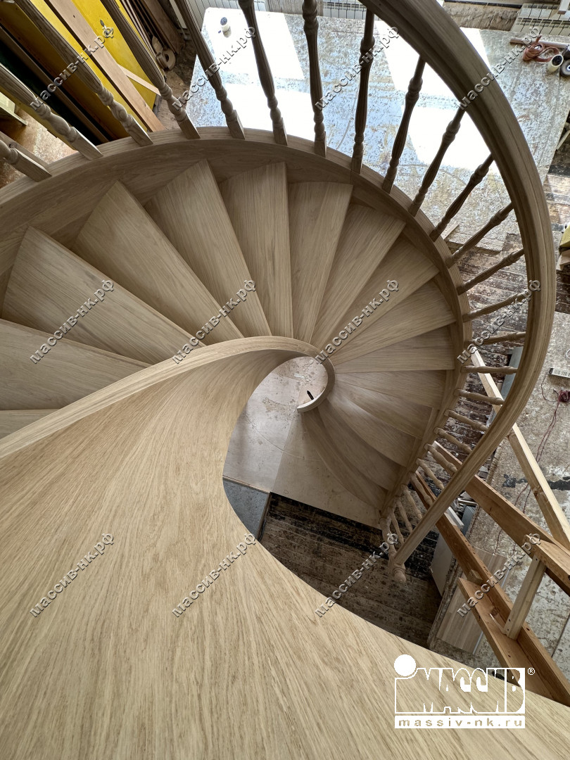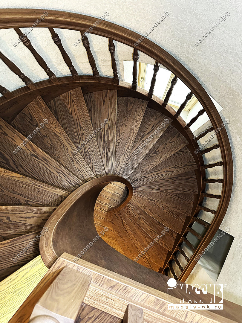 Это открытая самонесущая лестница - с веерными ступенями, поворотная на 270 градусов, на двух несущих изогнутых спиралевидных тетивах. Эта лестница – безопорная, что при её большом радиусе требовало от наших инженеров особо тщательных расчетов лестничного поворота. Она выполнена из благородного дуба комбинированной склейки. Первая ступень лестницы представляет собой радиусный массивный постамент, служащий опорой для лестничной конструкции.
