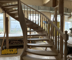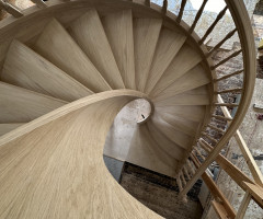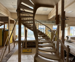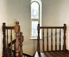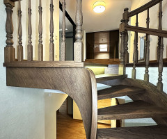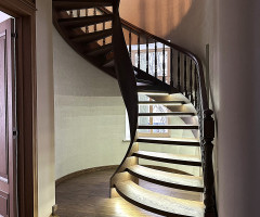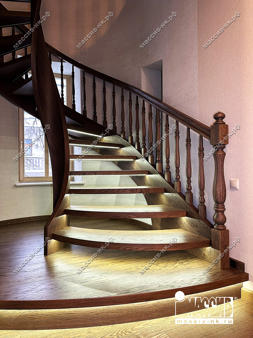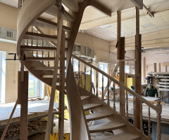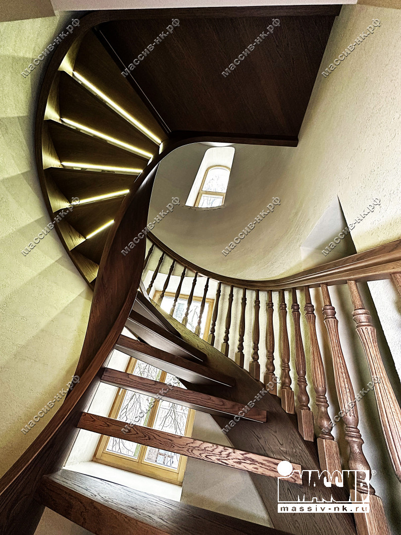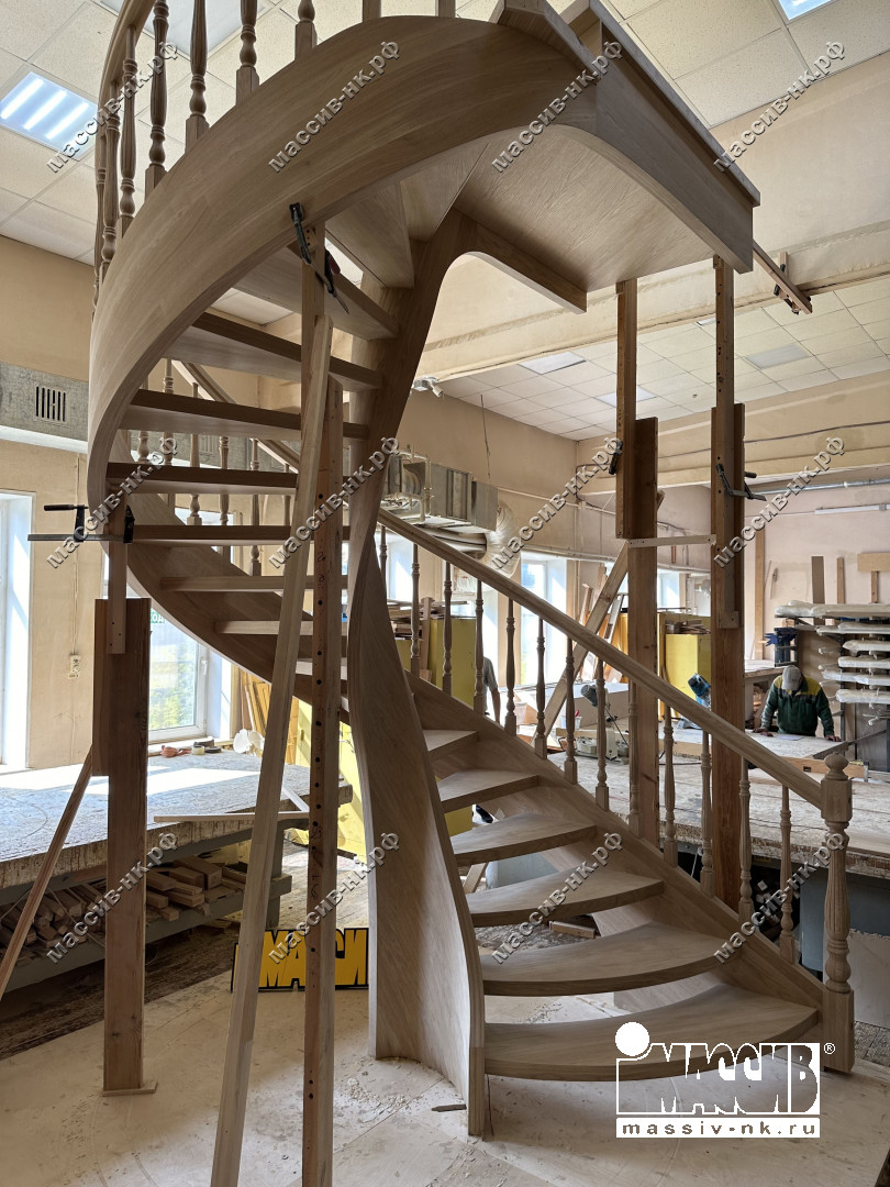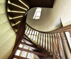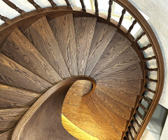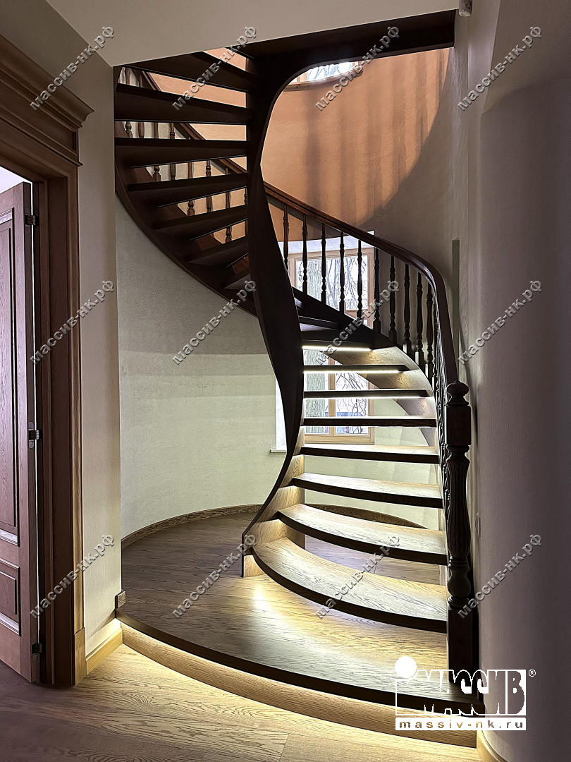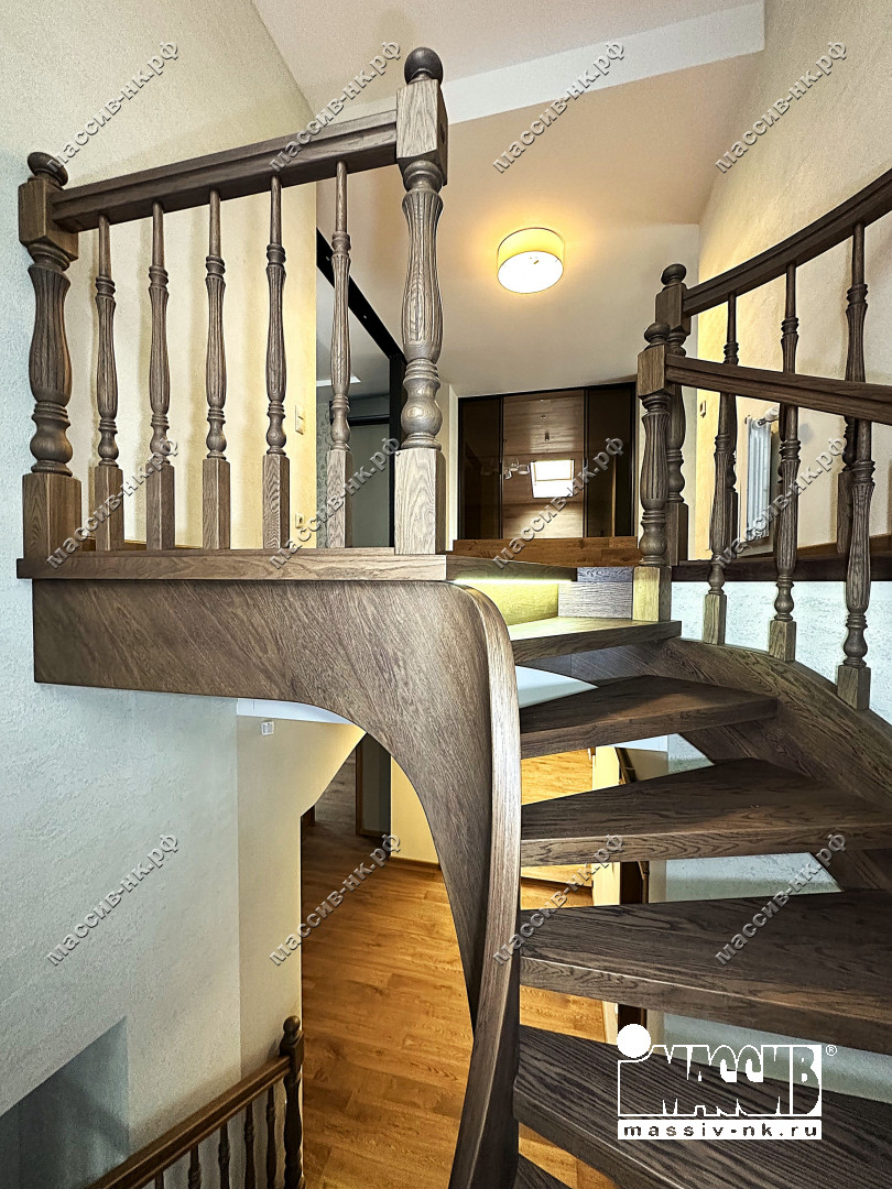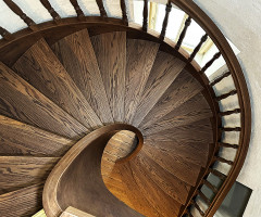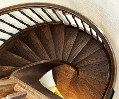 Это открытая самонесущая лестница - с веерными ступенями, поворотная на 270 градусов, на двух несущих изогнутых спиралевидных тетивах. Эта лестница – безопорная, что при её большом радиусе требовало от наших инженеров особо тщательных расчетов лестничного поворота. Она выполнена из благородного дуба комбинированной склейки. Первая ступень лестницы представляет собой радиусный массивный постамент, служащий опорой для лестничной конструкции.